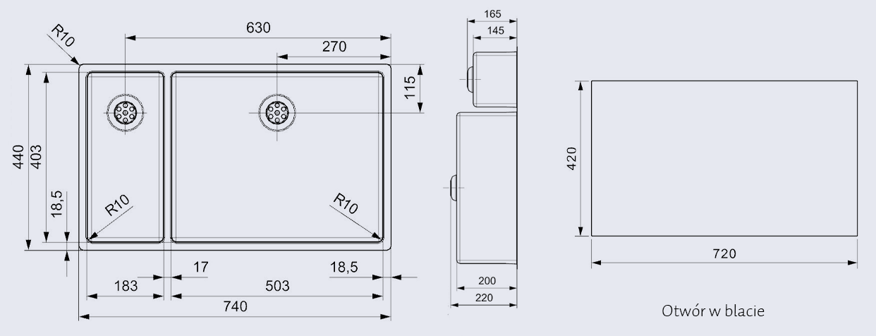 - TYP: stalowy wpuszczany, podwieszany i zintegrowany z blatem